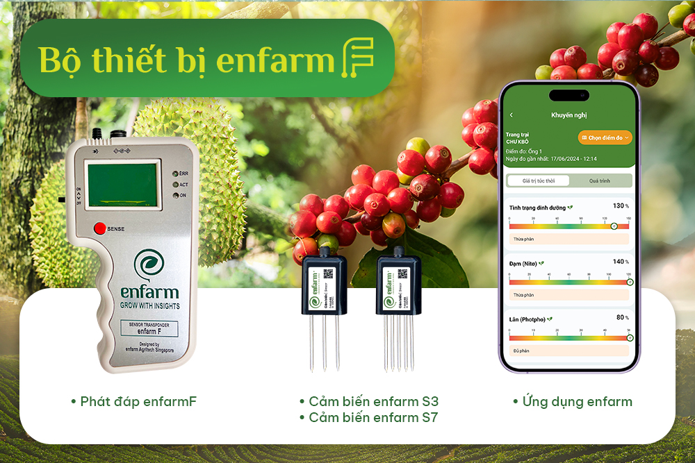 Một trong những thành tựu nổi bật của Enfarm là công nghệ bón phân thông minh, đã được thử nghiệm thực tế tại các vườn cà phê và sầu riêng ở Đắk Lắk. Kết quả cho thấy: giảm tới 30% lượng phân bón sử dụng, trong khi năng suất tăng tới 30%.