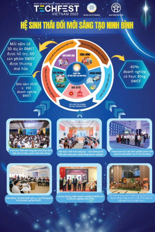 Từ ngày 11–14/12/2025, Sở Khoa học và Công nghệ tỉnh Ninh Bình tham dự Ngày hội Khởi nghiệp đổi mới sáng tạo quốc gia – TECHFEST Việt Nam 2025 và tổ chức gian hàng trưng bày tại Triển lãm sản phẩm, dịch vụ khởi nghiệp sáng tạo trong nước và quốc tế, diễn ra tại Thành phố Hà Nội.